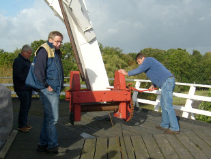 Onder het toeziend oog van zijn examinatoren zet John van Zutphen de molen “op de wind”.